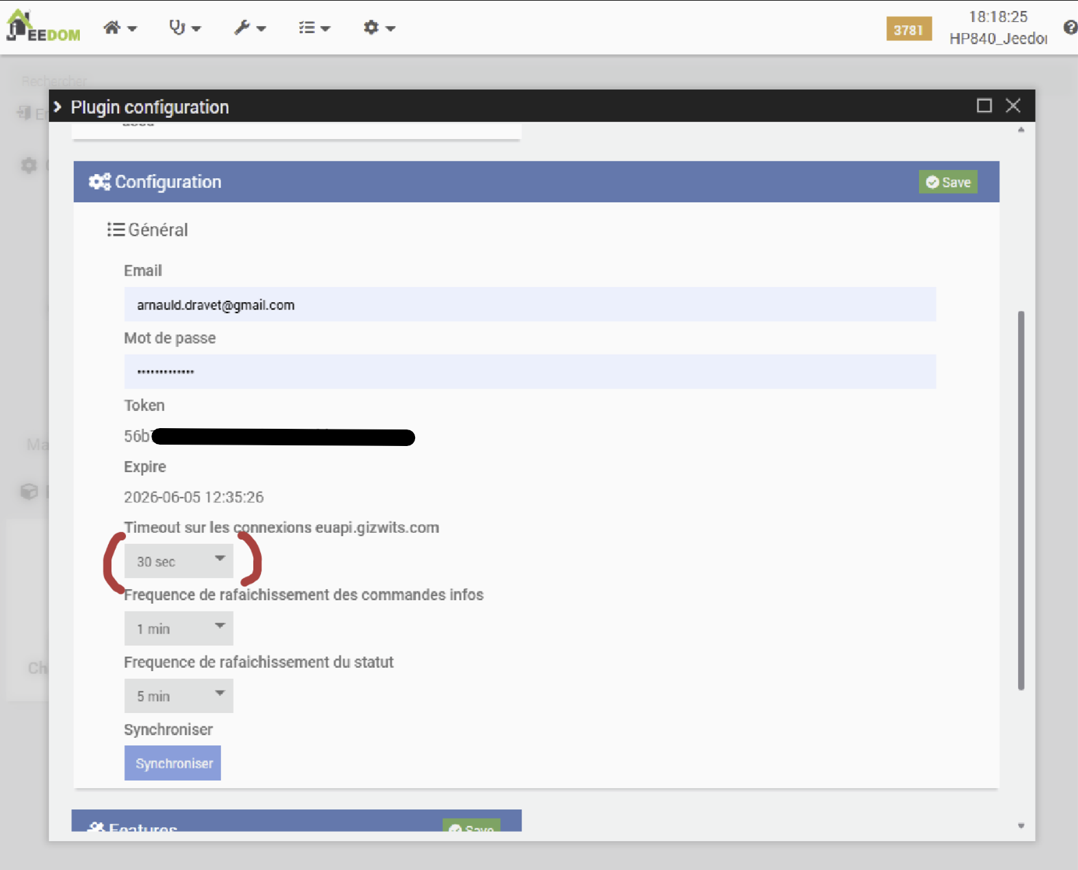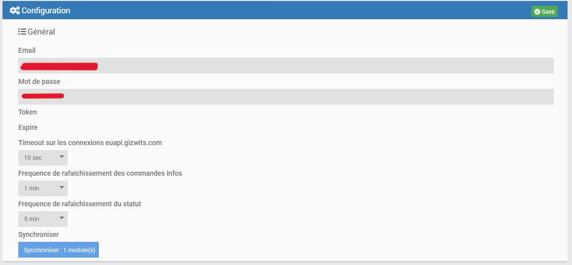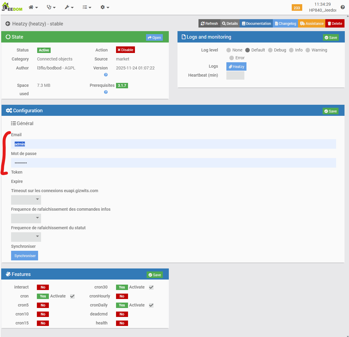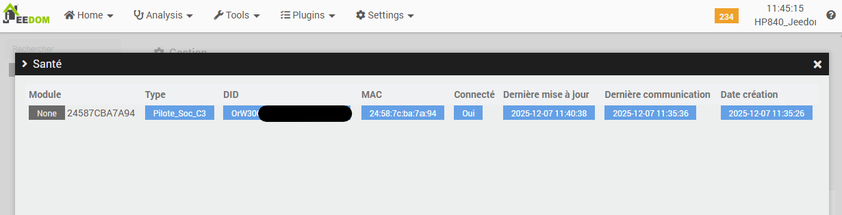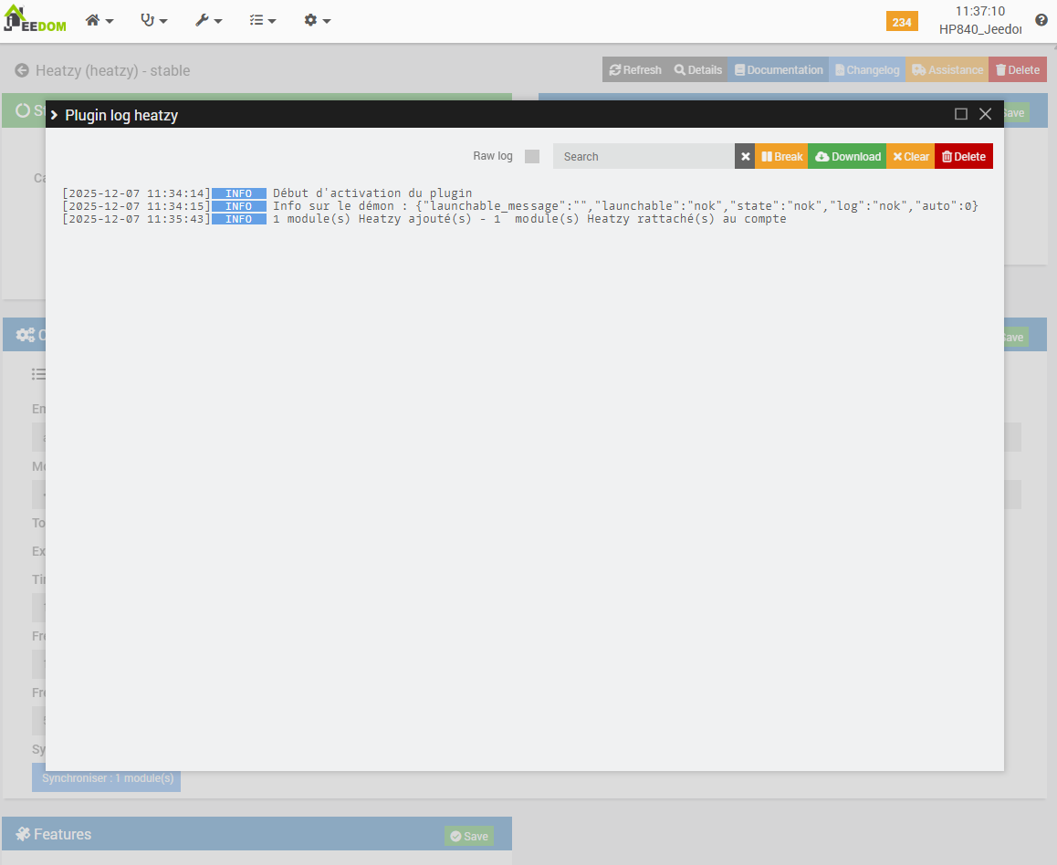 Once the functional configuration page of the plugin is accessed, the presence of a module is confirmed. Its identifier matches the MAC address previously identified within the Freebox administration interface, which also corresponds to the ID retrieved by the Heatzy mobile application during the pairing process. This indicates a consistent synchronization across all interfaces.