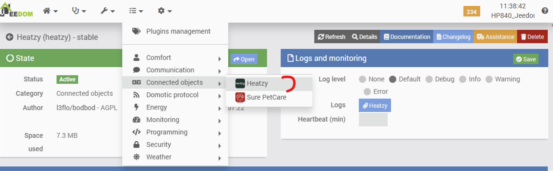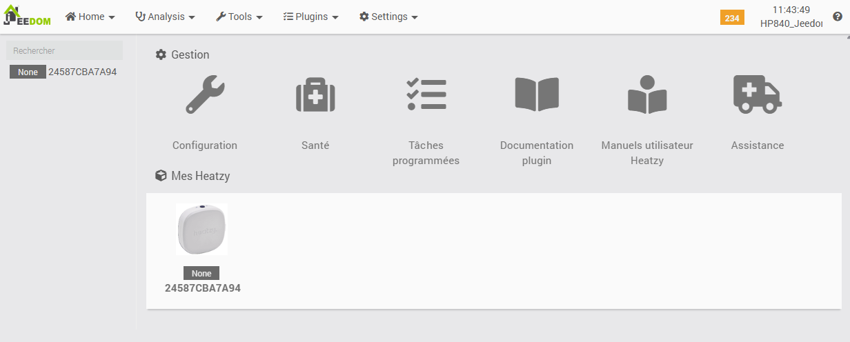 Since a module has been successfully retrieved into Jeedom from the Heatzy infrastructure, we shall proceed with its configuration. To do so, the plugin interface is accessed via the corresponding entry in the dedicated menu.
