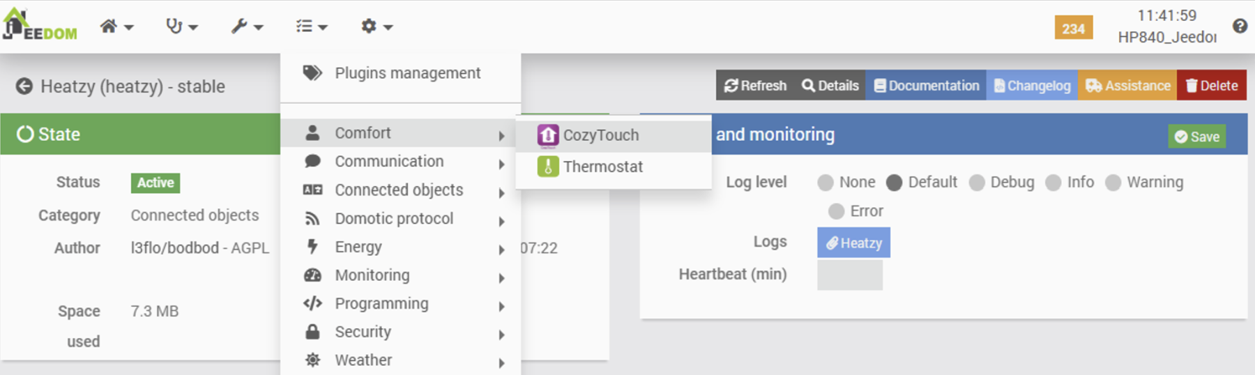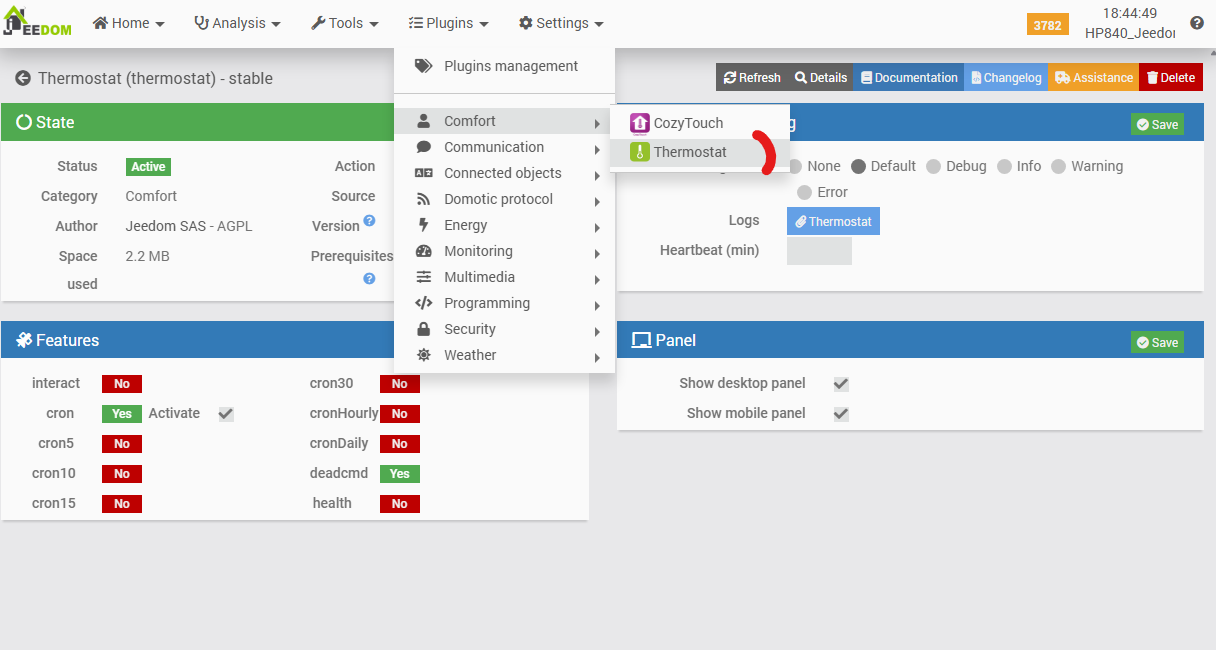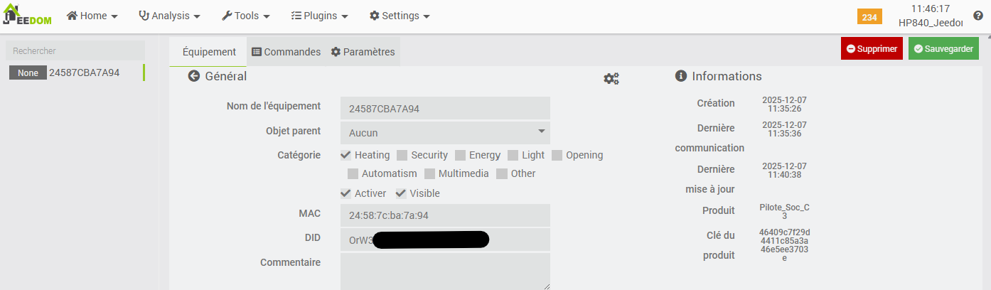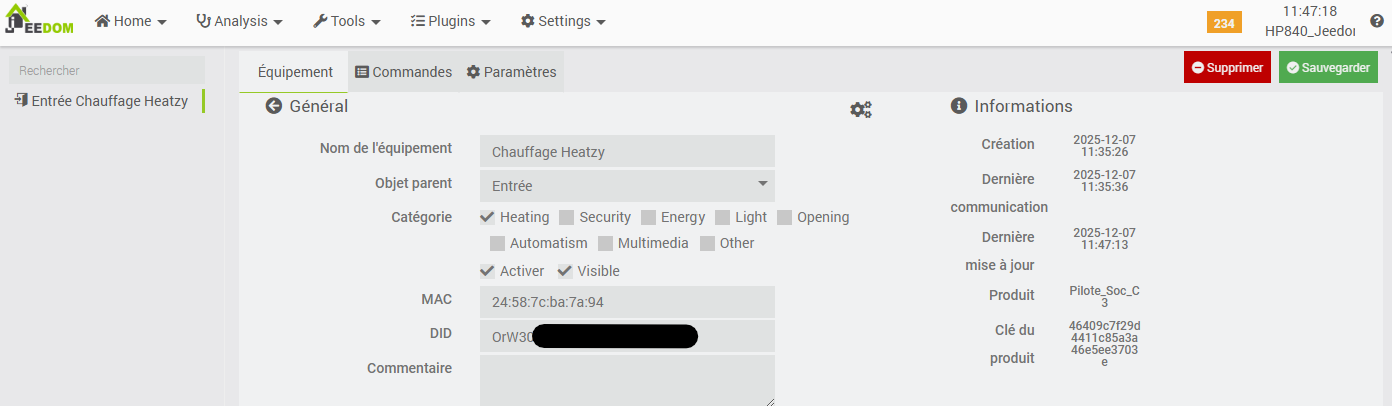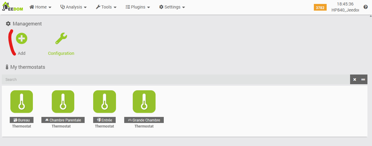 It is noteworthy that this plugin is accessible via the ‘Connected Objects’ menu, whereas other heating-related plugins (such as the Cozytouch plugin or the ‘standard’ Jeedom Thermostat plugin) are located under the ‘Comfort’ menu. While this does not constitute a technical issue per se, and may appear as a minor detail, it nonetheless results in a lack of overall consistency within the interface.
