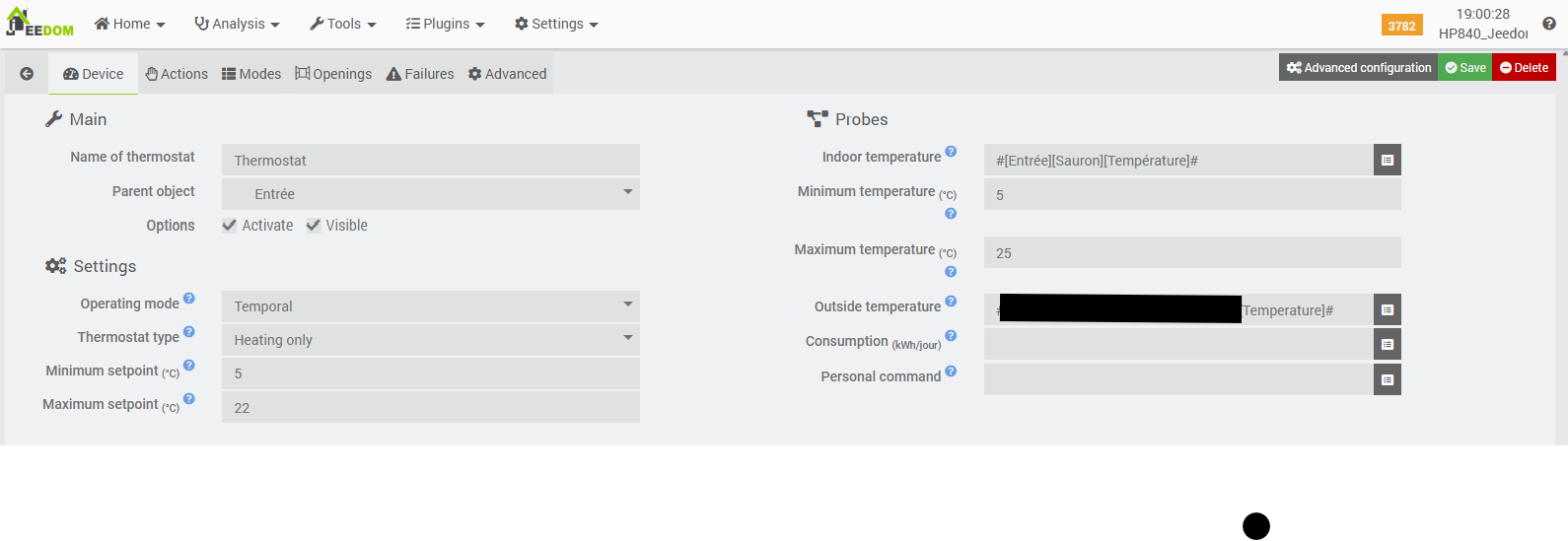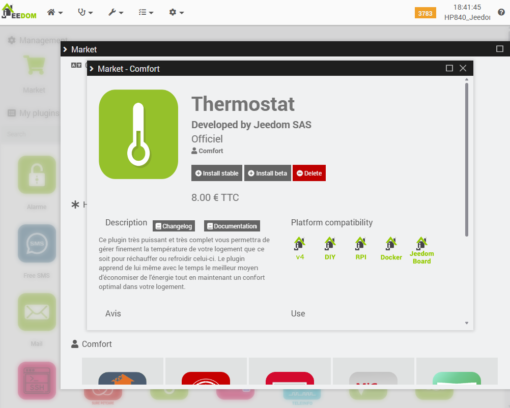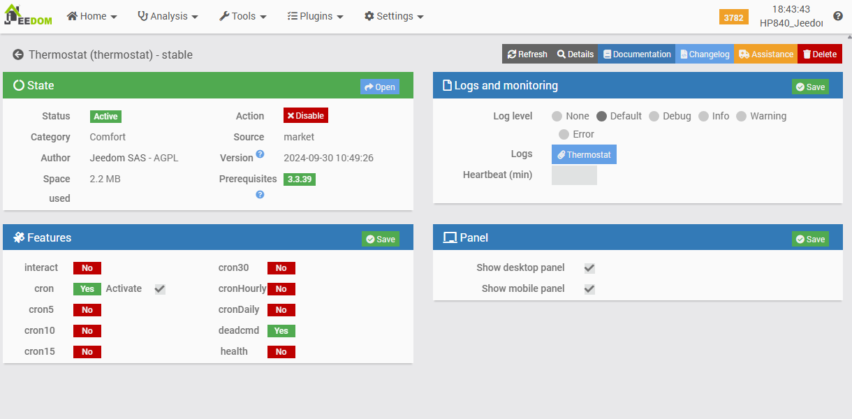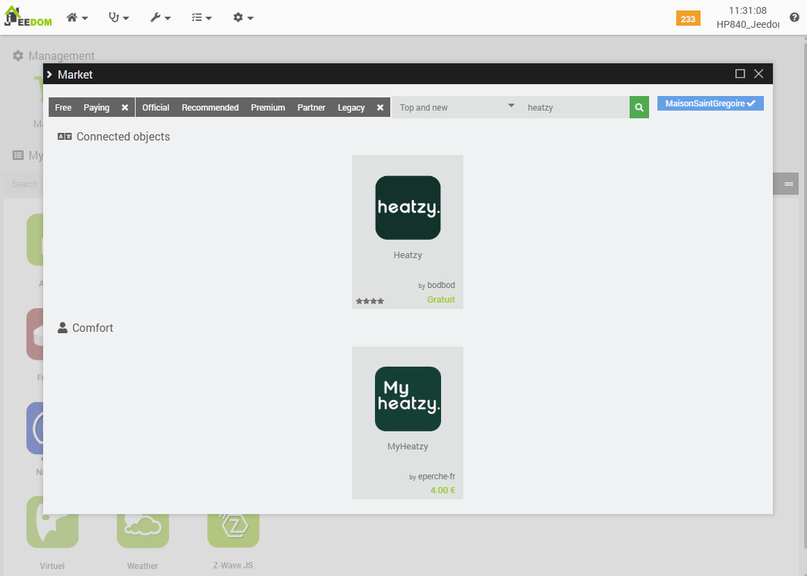 It is noteworthy that this plugin is accessible via the ‘Connected Objects’ menu, whereas other heating-related plugins (such as the Cozytouch plugin or the ‘standard’ Jeedom Thermostat plugin) are located under the ‘Comfort’ menu. While this does not constitute a technical issue per se, and may appear as a minor detail, it nonetheless results in a lack of overall consistency within the interface.