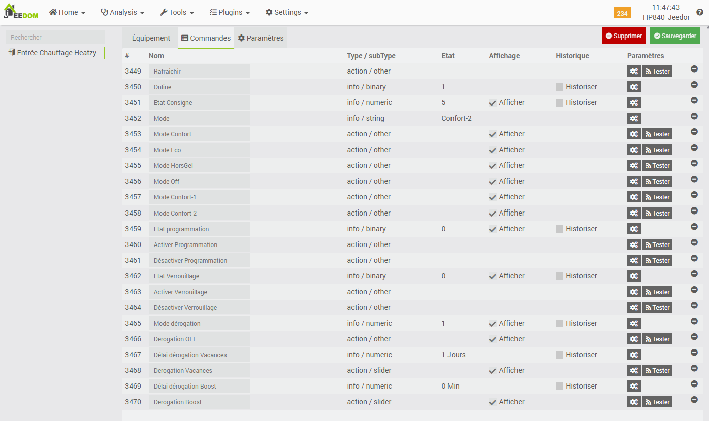 - As seen earlier, a slight latency can sometimes be observed between the moment a command is sent via the Jeedom interface and the moment it is relayed by the Heatzy infrastructure back to the module.