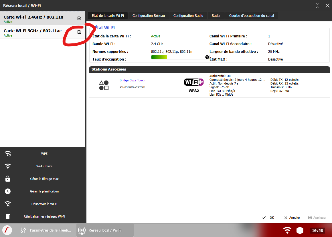 On a Freebox, this is done via the admin interface: just uncheck a box and don’t forget to apply at the bottom. For other ISPs, I’m not sure, but I recall it’s also possible to temporarily disable 5 GHz on an Orange box.