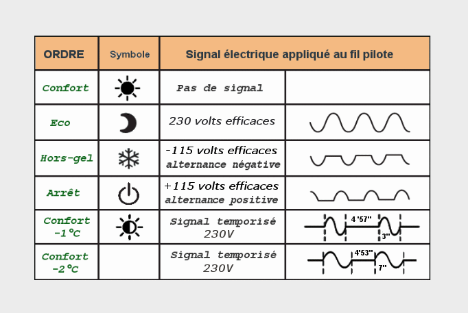 | Radiator Mode | Signal between Pilot Wire and Neutral | Typical 230V Bulb Response |