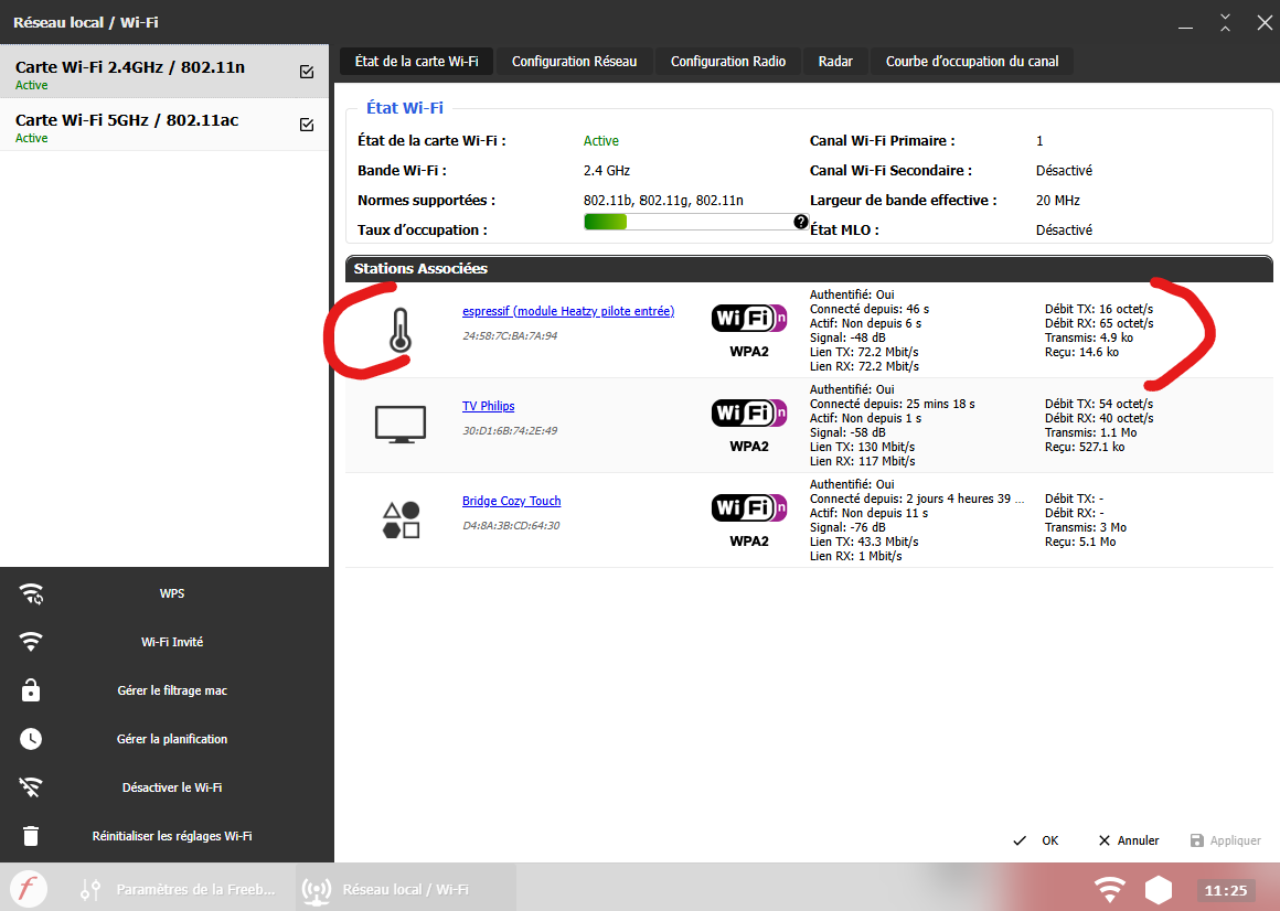 - The Wi-Fi can be made to work on the 5GHz band with some effort, but without any guarantee of long-term stability (in fact, I notice today that the module is controllable via Wi-Fi, yet it does not appear in my Freebox’s list of connected devices…).