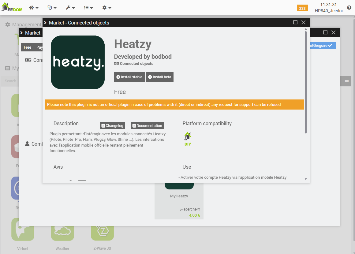 - Occasional latency issues. In my opinion, dual management via both the Heatzy mobile interface and the Jeedom interface should be avoided: choose one or the other to minimize the risks of desynchronization and outdated displays.