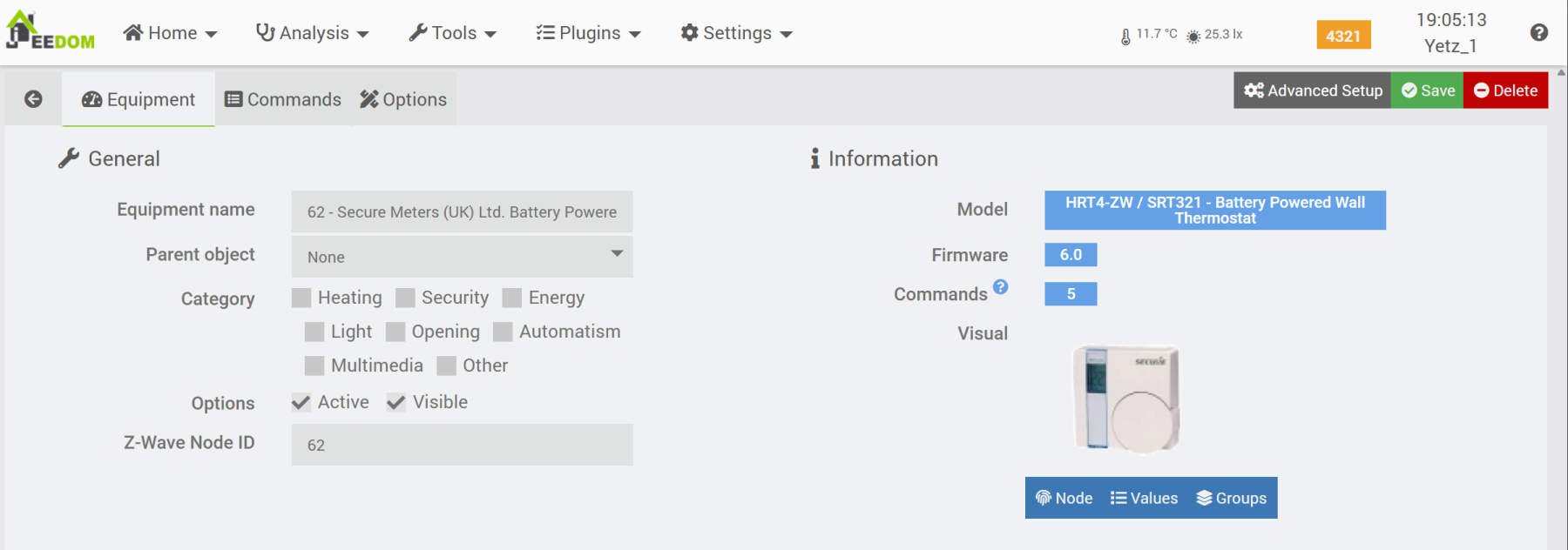 Note: In the remainder of this tutorial, the device has been renamed “SRT321” and assigned to the “Entrance” parent object, which also contains the radiator we intend to control via its Heatzy module.