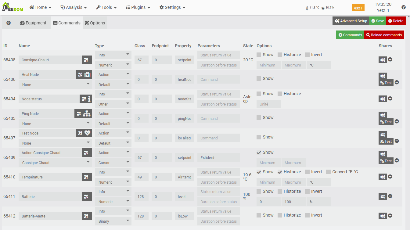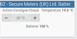 - The “Action-Consigne-Chaud” action command: used to update the setpoint temperature on the SRT from Jeedom (this requires the battery-powered module to wake up to receive and display the new temperature).