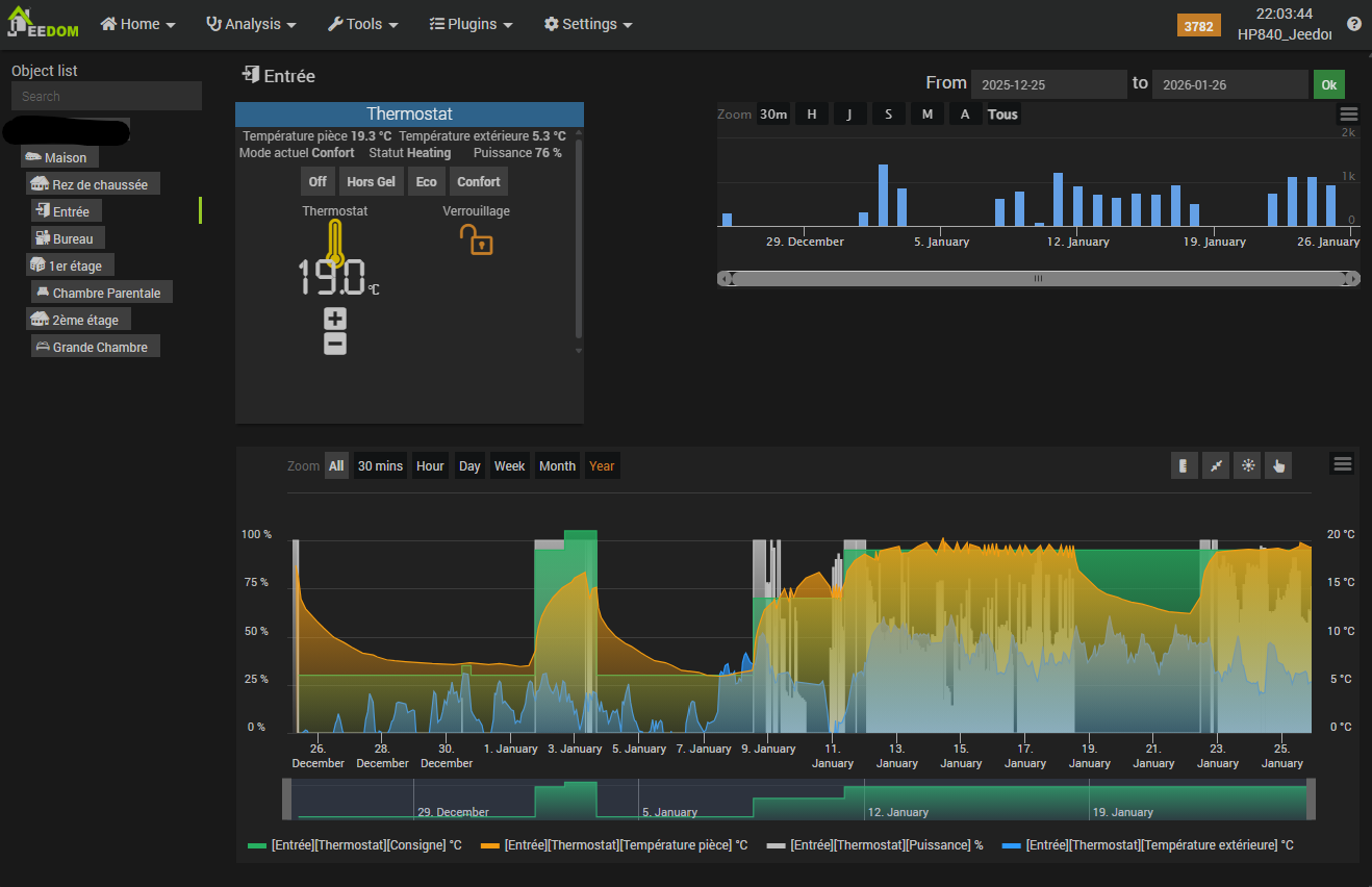 In summary, this setup—combining the Heatzy Pilot Wire Wi-Fi module, the Jeedom Heatzy plugin, the Jeedom Thermostat plugin, and an SRT321 wall thermostat—allows for full utilization of the pilot wire while standardizing the control of diverse radiators within a single interface. Despite some limitations (dependency on the Internet and the Heatzy cloud, recurring HTTP 502 errors, and latency inherent to the connected model and the use of battery-powered modules), the system remains stable, effective, and flexible enough to be integrated into advanced home automation focused on comfort and energy optimization.