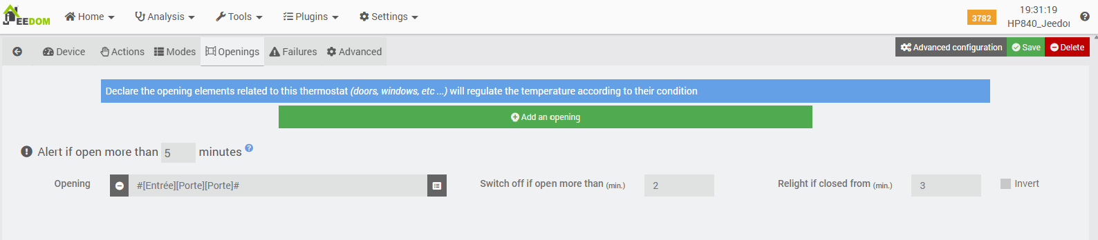 Let’s zoom in on the first scenario, which detects a setpoint change on the Jeedom “Entrance” thermostat to report it on the SRT-321 display associated with the same room.