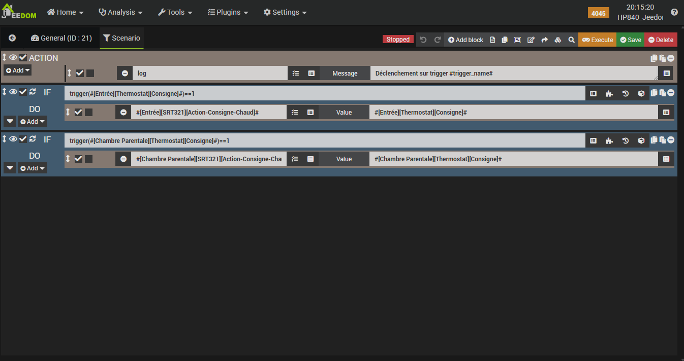 As you can see, the principle is very simple, but there is a slight subtlety: this scenario handles the updates for several SRT modules throughout the house. Therefore, we will “monitor” the setpoint changes of multiple Jeedom thermostats and reflect a specific thermostat’s change onto the “correct” SRT—the one located in the same room: