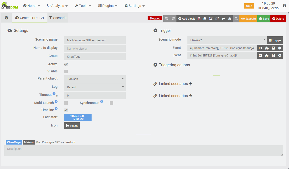 - 2nd screenshot: we verify the trigger using trigger(), and accordingly, we assign the value of the room’s Jeedom thermostat to the corresponding SRT321 thermostat.